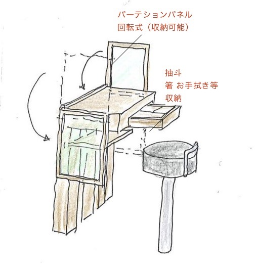 また席が一席づつ分離できるパーテションが回転可動できるように考えました。